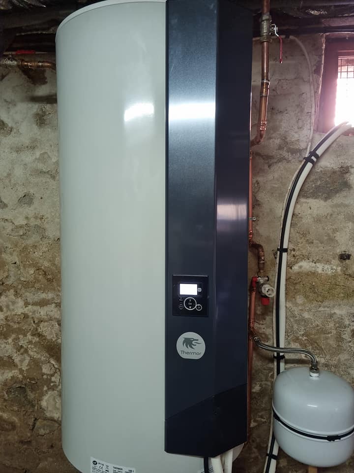 Notre solution pour ce client a été d'installer un chauffe-eau thermodynamique de marque Thermor, avec une unité extérieure. Ce chauffe-eau a un COP de 3, ce qui signifie que 1 kW d'électricité consommé produira 3 kW de chauffage pour l'eau chaude sanitaire. Cela pourrait diviser par 3 leur coût annuel pour chauffer l'eau.